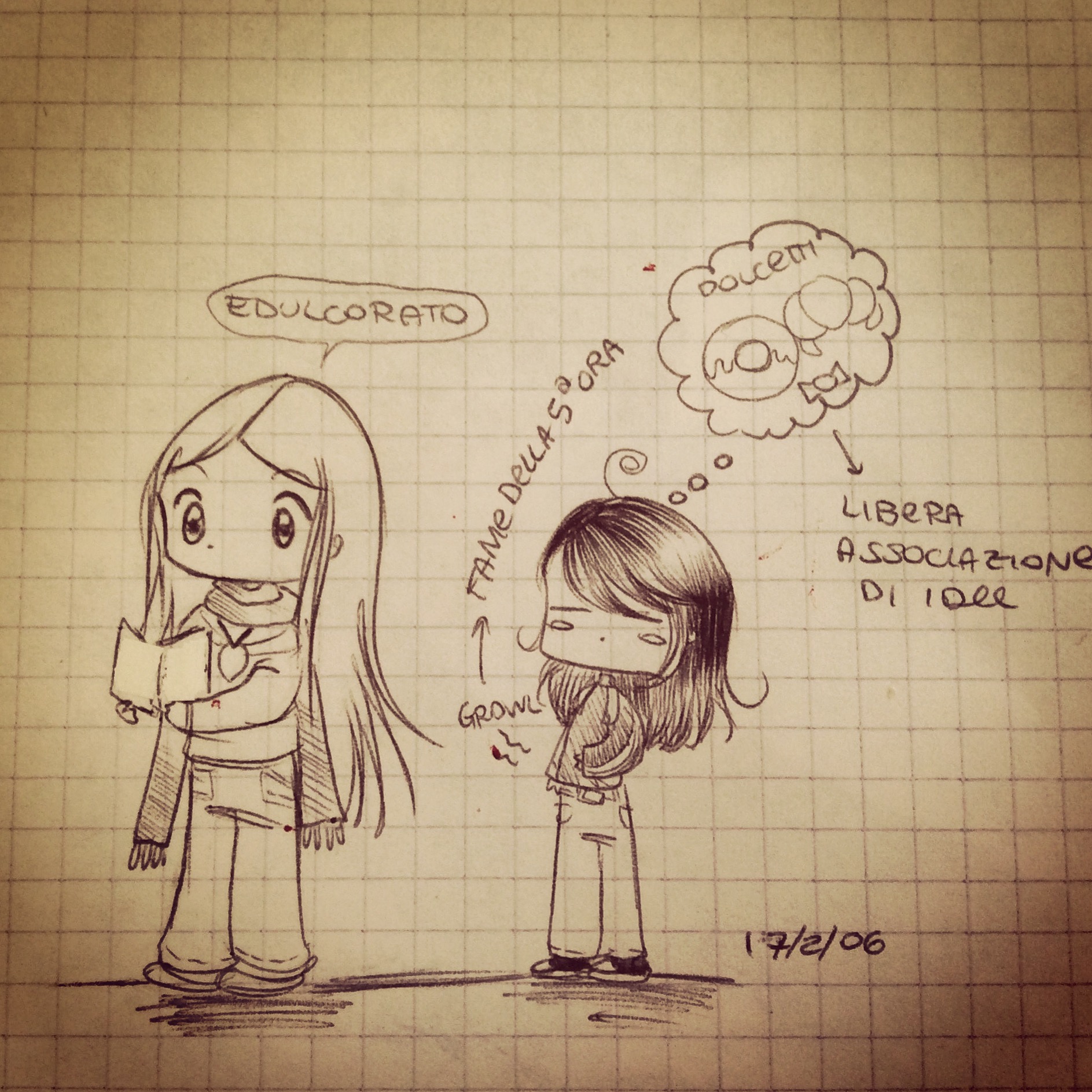 L’immagine, che ho scelto perché mette a fuoco con levità il tema della parola (semplice, colloquiale, rarefatta), è opera di un’alunna carissima, a cui vanno i miei ringraziamenti. Appassionata e fantasiosa disegnatrice, Elisa Coletti realizzò questo ritratto durante un’ora di Letteratura italiana (verosimilmente non proprio irresistibile…)